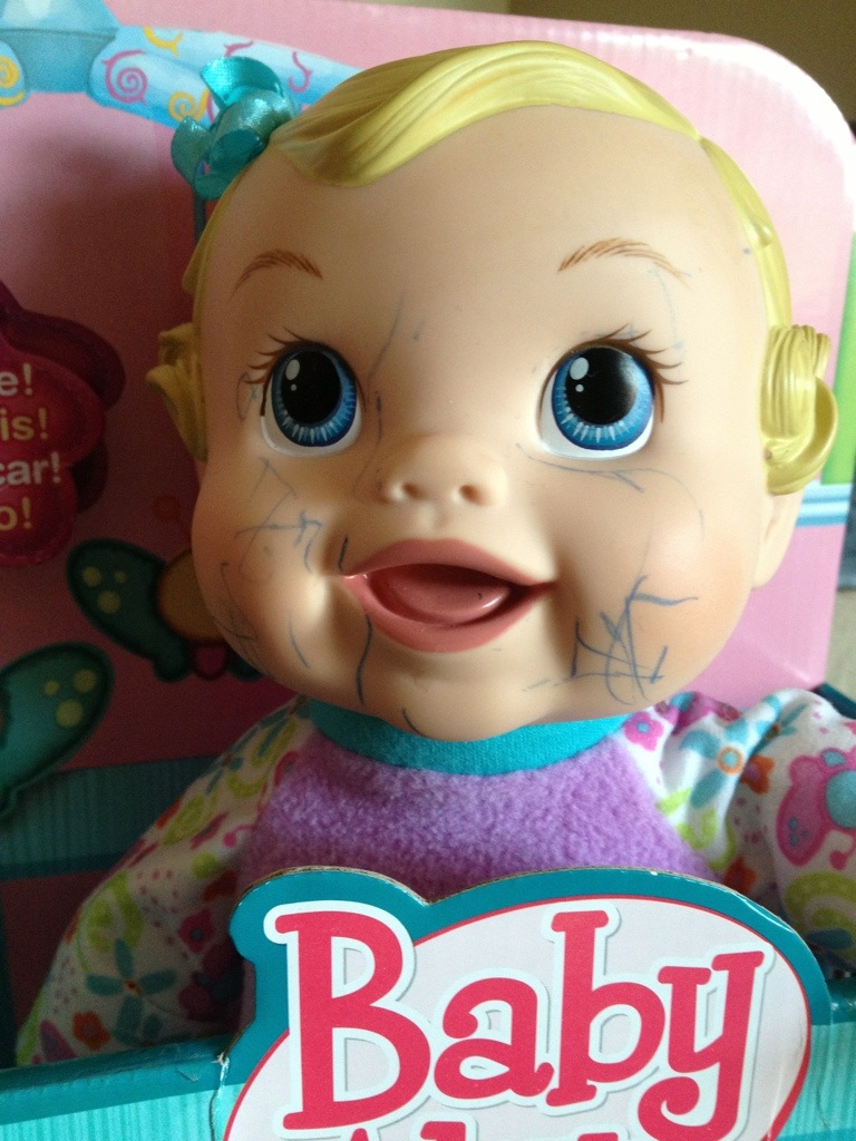 This little doll just arrived, still in her initial box and she’s already been drawn on.