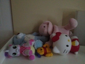 We went through the monkey, hello kitty, Whinny the Pooh, who are all sitting on the night stand.